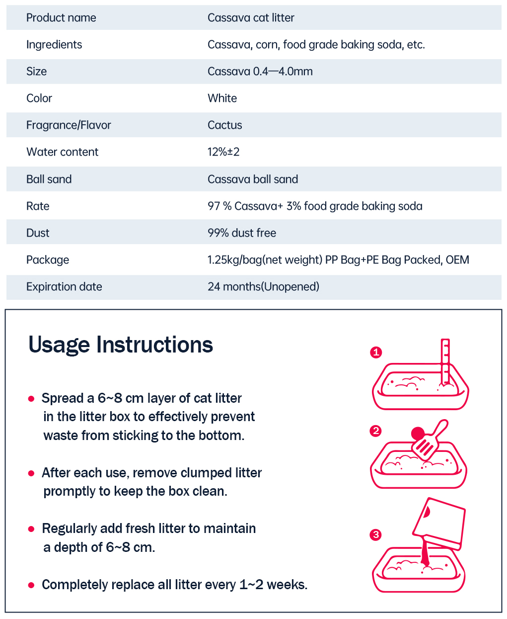 Its unique golden particle ratio combines larger particles for enhanced absorption and reduced tracking, with smaller particles filling gaps to prevent sticking. Cassava powder locks in moisture and forms firm clumps, while baking soda neutralizes odors at the source through pH balance.