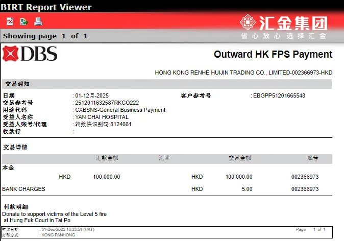 Henan Huijin Group Donates HKD 100,000 to Support Relief Efforts for Hong Kong's Tai Po Fire