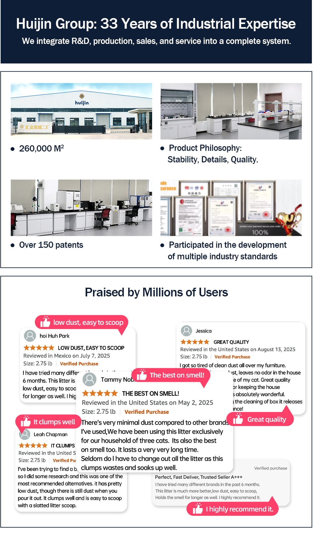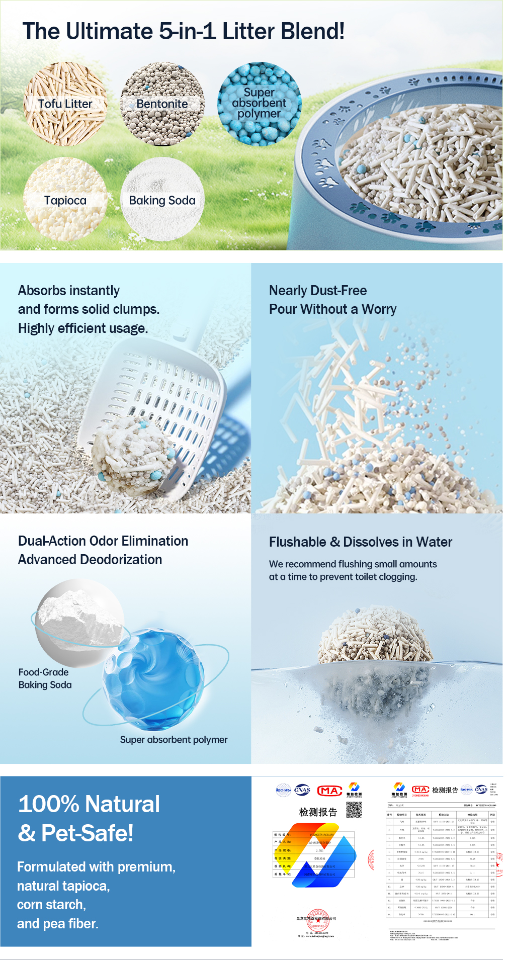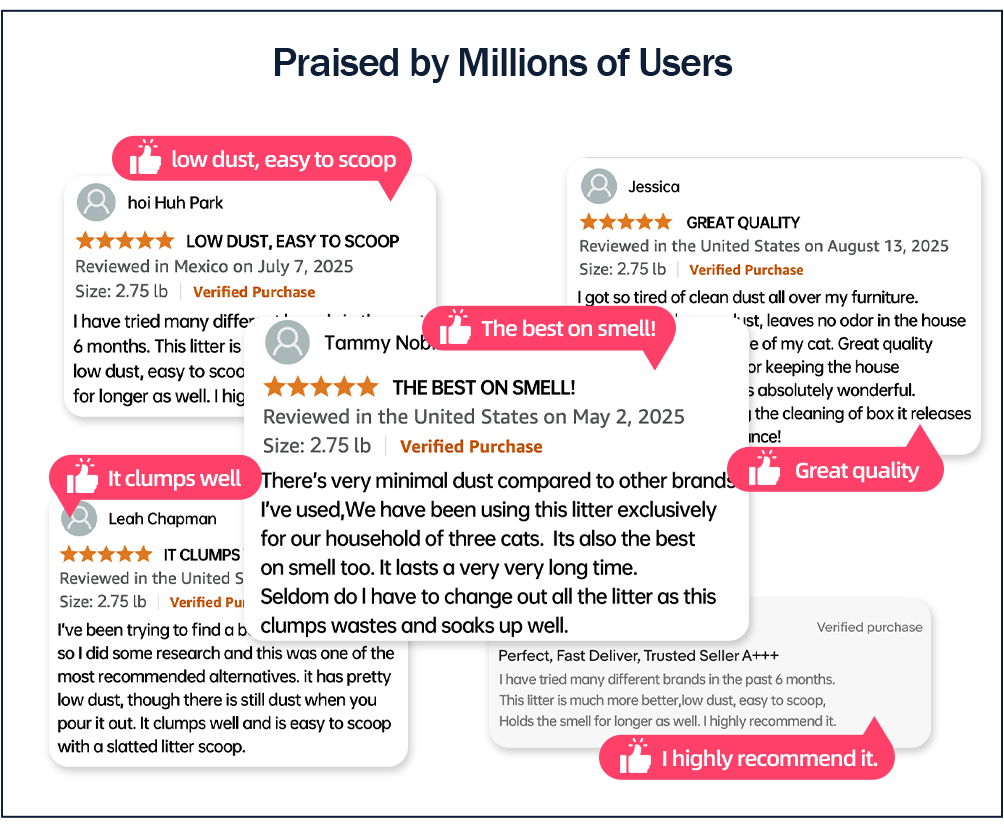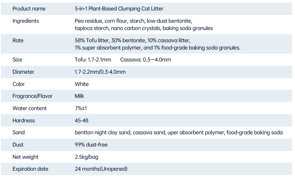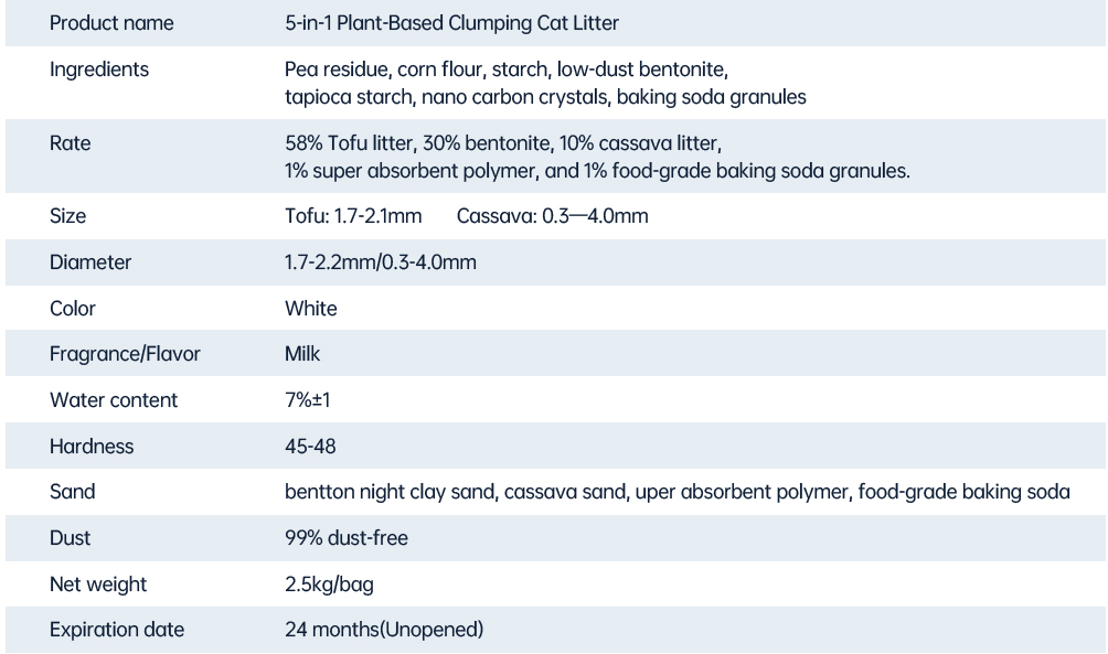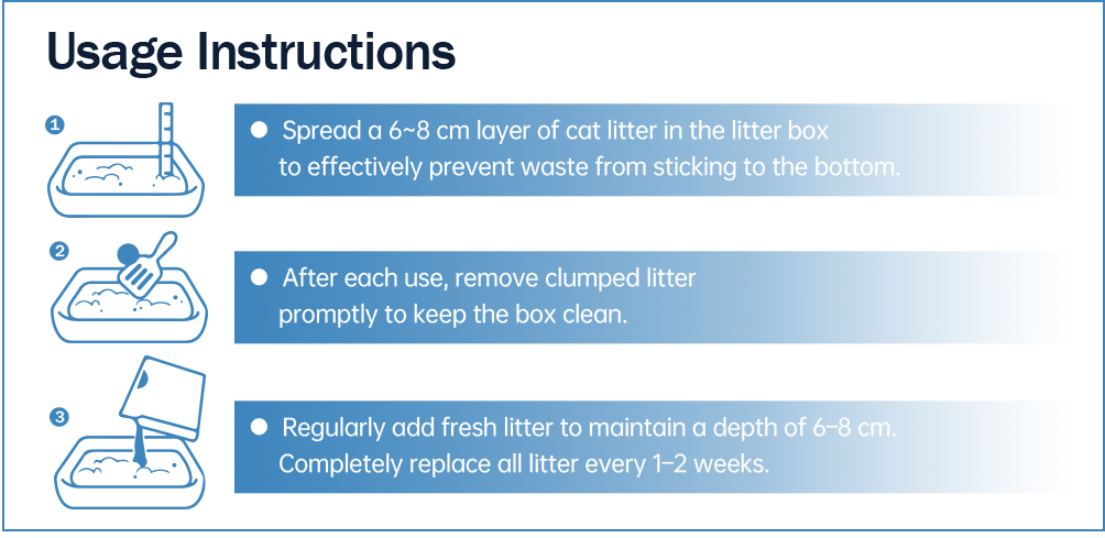 The food-grade tofu litter is safe, eco-friendly,and flushable. Bentonite enhances absorption and forms tight, firm clumps. Tapioca litter locks in moisture quickly, prevents sticking to the litter box, and makes cleaning easier. Nano carbon crystals physically absorb odors, while baking soda neutralizes them at the source—working together to boost overall odor control. Crafted with a unique low-dust process, this litter helps protect your cat’s respiratory and urinary health, ensuring both feline comfort and owner convenience.
