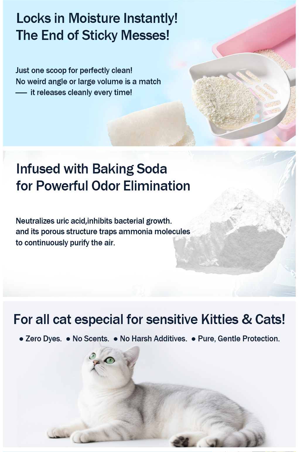 Its unique golden particle ratio combines larger particles for enhanced absorption and reduced tracking, with smaller particles filling gaps to prevent sticking. Cassava powder locks in moisture and forms firm clumps, while baking soda neutralizes odors at the source through pH balance.