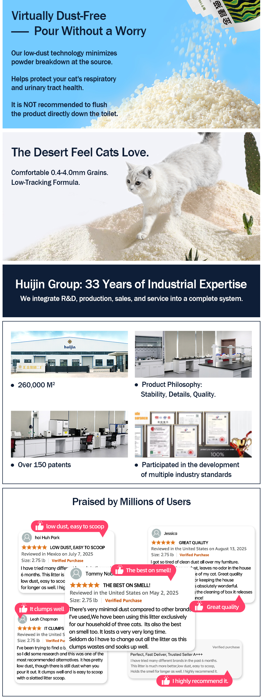The new-generation Jintong Cat Cassava Cat Litter is made from 97% edible-grade cassava and 3% food grade baking soda, ensuring safety from the materials. Free of fragrances, dyes, and irritating adhesives, it is safe for kittens and allergic cats. Upon contact with water, it absorbs instantly within 3 seconds, forming elastic clumps with high hardness that resist breaking—even under unusual urination postures.