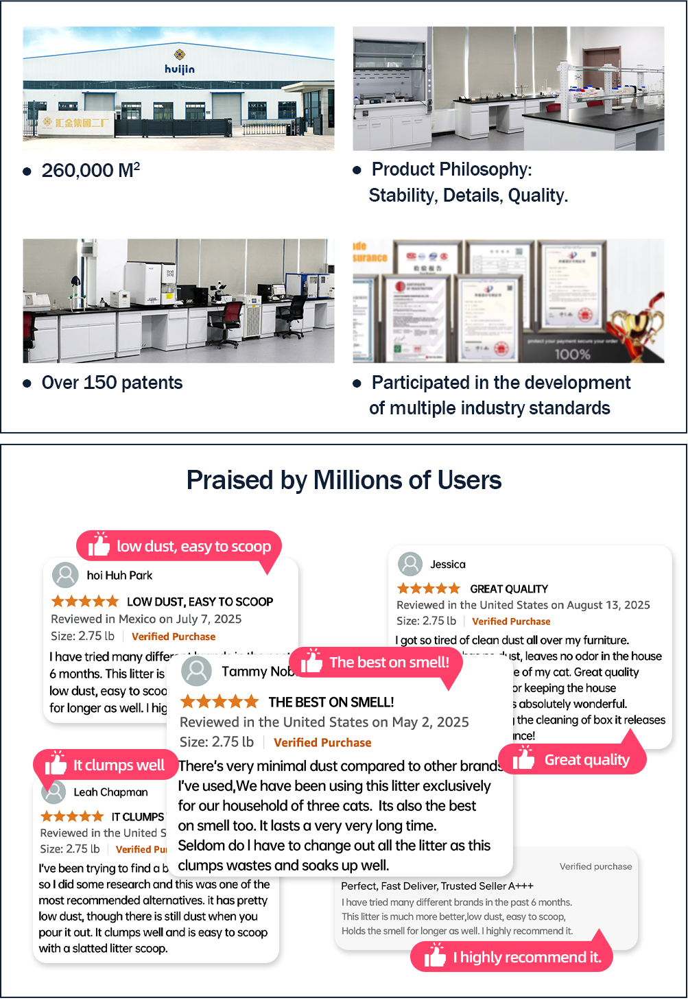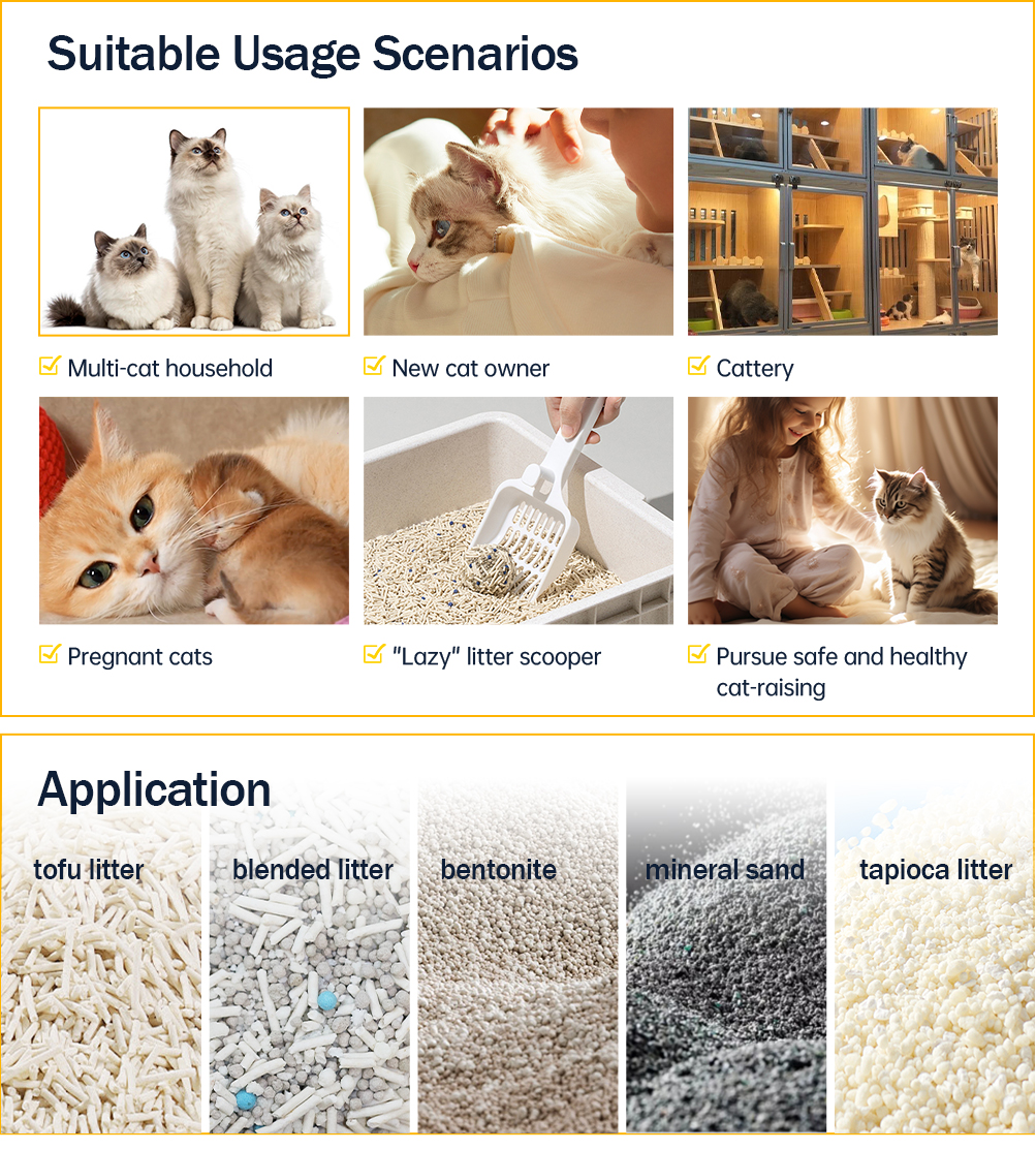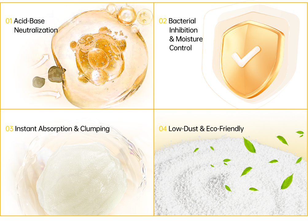 The food-grade tofu litter is safe, eco-friendly,and flushable. Bentonite enhances absorption and forms tight, firm clumps. Tapioca litter locks in moisture quickly, prevents sticking to the litter box, and makes cleaning easier. Nano carbon crystals physically absorb odors, while baking soda neutralizes them at the source—working together to boost overall odor control. Crafted with a unique low-dust process, this litter helps protect your cat’s respiratory and urinary health, ensuring both feline comfort and owner convenience.